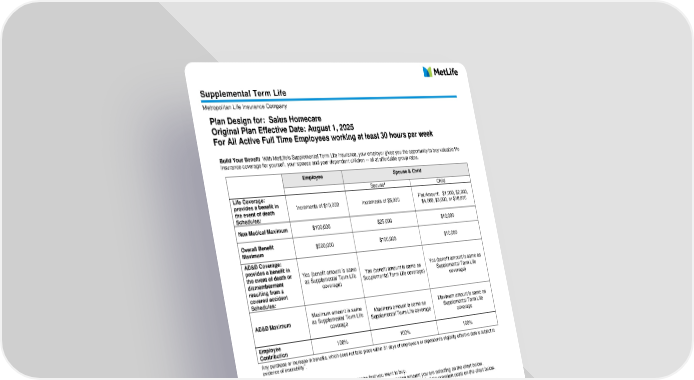 LI-GCERT-SUPP-OVER EOL Benefit Summary 200 Park Ave., New York, NY 10166 © 2024 MetLife Services and Solutions, LLC L0624041029[exp0626][All States] Nothing in these materials is intended to be advice for a particular situation or individual. Please consult with your own advisors for such advice. Like most group insurance policies, insurance policies offered by MetLife contain certain exclusions, exceptions, waiting periods, reductions, limitations and terms for keeping them in force. Please contact your benefits administrator or MetLife for costs and complete details. This summary provides an overview of your plan’s benefits. These benefits are subject to the terms and conditions of the contract between MetLife and your employer and are subject to each state’s laws and availability. Specific details regarding these provisions can be found in the booklet certificate. Life and AD&D coverages are provided under a group insurance policy (Policy Form GPN99/G2130-S) issued to your employer by MetLife. Life and AD&D coverages under your employer’s plan terminates when your employment ceases, when your Life and AD&D contributions cease, or upon termination of the group insurance policy. Dependent Life coverage will terminate when a dependent no longer qualifies as a dependent or as otherwise determined by plan design. Should your life insurance coverage terminate, for reasons other than non-payment of premium, you may convert it to a MetLife individual permanent policy without providing medical evidence of insurability.