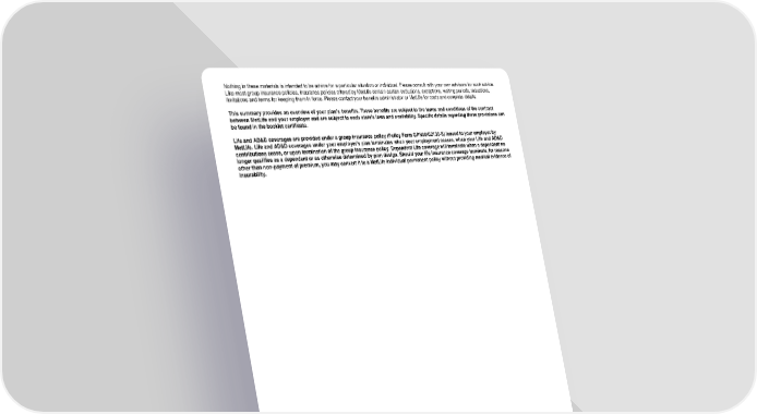 LI-GCERT-SUPP-OVER EOL Benefit Summary 200 Park Ave., New York, NY 10166 © 2024 MetLife Services and Solutions, LLC L0624041029[exp0626][All States] Nothing in these materials is intended to be advice for a particular situation or individual. Please consult with your own advisors for such advice. Like most group insurance policies, insurance policies offered by MetLife contain certain exclusions, exceptions, waiting periods, reductions, limitations and terms for keeping them in force. Please contact your benefits administrator or MetLife for costs and complete details. This summary provides an overview of your plan’s benefits. These benefits are subject to the terms and conditions of the contract between MetLife and your employer and are subject to each state’s laws and availability. Specific details regarding these provisions can be found in the booklet certificate. Life and AD&D coverages are provided under a group insurance policy (Policy Form GPN99/G2130-S) issued to your employer by MetLife. Life and AD&D coverages under your employer’s plan terminates when your employment ceases, when your Life and AD&D contributions cease, or upon termination of the group insurance policy. Dependent Life coverage will terminate when a dependent no longer qualifies as a dependent or as otherwise determined by plan design. Should your life insurance coverage terminate, for reasons other than non-payment of premium, you may convert it to a MetLife individual permanent policy without providing medical evidence of insurability.