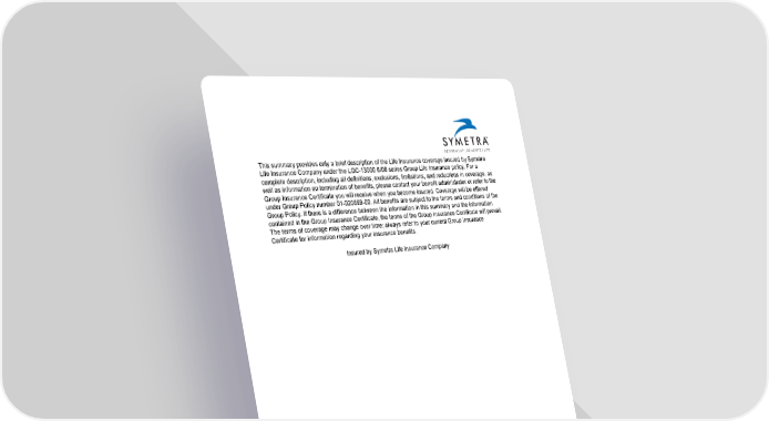 This summary provides only a brief description of the Life Insurance coverage insured by Symetra Life Insurance Company under the LGC-13000 8/06 series Group Life Insurance policy. For a complete description, including all definitions, exclusions, limitations, and reductions in coverage, as well as information on termination of benefits, please contact your benefit administrator or refer to the Group Insurance Certificate you will receive when you become insured. Coverage will be offered under Group Policy number 01-020899-00. All benefits are subject to the terms and conditions of the Group Policy. If there is a difference between the information in this summary and the information contained in the Group Insurance Certificate, the terms of the Group Insurance Certificate will prevail. The terms of coverage may change over time; always refer to your current Group Insurance Certificate for information regarding your insurance benefits. Insured by Symetra Life Insurance Company Symetra® is a registered service mark of Symetra Life Insurance Company. LGP-2319/Other-Class 1 2/17