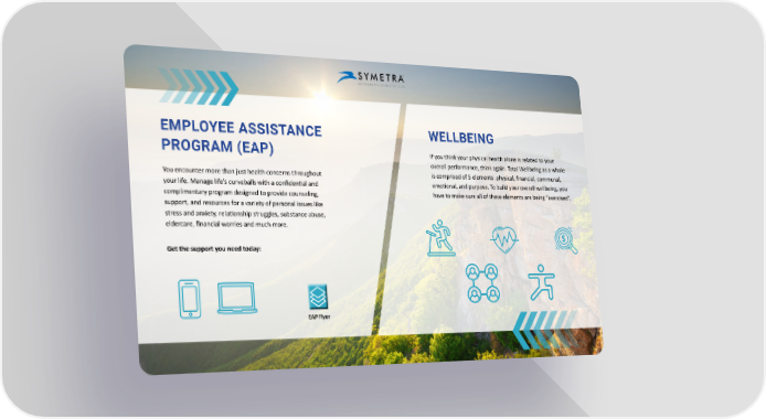EMPLOYEE ASSISTANCE WELLBEING PROGRAM (EAP) If you think your physical health alone is related to your overall performance, think again. Total Wellbeing as a whole is comprised of 5 elements: physical, financial, communal, You encounter more than just health concerns throughout emotional, and purpose. To build your overall wellbeing, you your life. Manage life’s curveballs with a confidential and have to make sure all of these elements are being “exercised”. complimentary program designed to provide counseling, support, and resources for a variety of personal issues like stress and anxiety, relationship struggles, substance abuse, eldercare, financial worries and much more. Get the support you need today: EAP Flyer