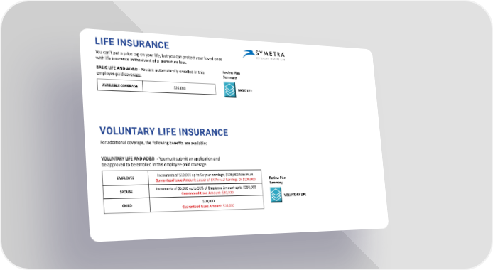 LIFE INSURANCE You can't put a price tag on your life, but you can protect your loved ones with life insurance in the event of a premature loss. BASIC LIFE AND AD&D - You are automatically enrolled in this Review Plan Summary employer-paid coverage. AVAILABLE COVERAGE $25,000 BASIC LIFE VOLUNTARY LIFE INSURANCE For additional coverage, the following benefits are available: VOLUNTARY LIFE AND AD&D - You must submit an application and be approved to be enrolled in this employee-paid coverage. EMPLOYEE Increments of $10,000 up to 5x your earnings; $500,000 Maximum Review Plan Guaranteed Issue Amount: Lesser of 3X Annual Earnings Or $100,000 Summary SPOUSE Increments of $5,000 up to 50% of Employee Amount up to $250,000 Guaranteed Issue Amount: $30,000 VOLUNTARY LIFE CHILD $10,000 Guaranteed Issue Amount: $10,000
