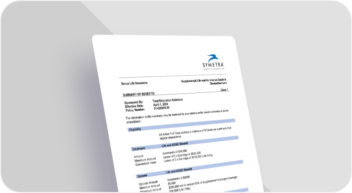 Group Life Insurance Supplemental Life and Accidental Death & Dismemberment SUMMARY OF BENEFITS Class 1 Sponsored By: Total Education Solutions Effective Date: April 1, 2024 Policy Number: 01-020899-00 The information in this summary may be replaced by any subsequently issued summary or policy amendment. Eligibility All Active Full Time working a minimum of 30 hours per week and their eligible dependents. Employee Life and AD&D Benefit Amount Increments of $10,000 Maximum Amount Lesser of 5 x Earnings or $500,000 Guaranteed Issue Lesser of 3 x Earnings or $100,000 (Life Only) Spouse Life and AD&D Benefit Spouse Amount Increments of $5000 Minimum Amount $5,000 Maximum Amount $250,000 not to exceed 50% of Supplemental Employee Coverage Guaranteed Issue $30,000 (Life Only) Child Life and AD&D Benefit Child Amount Live Birth to 26 year(s): $10,000 Benefit Reduction Employee and Spouse Original Benefit 65% at age 65 Amount Reduced To 25% at age 80 Evidence of Insurability Evidence of Insurability is required for all amounts of insurance selected after the initial 31 day eligibility period and for any amount in excess of the Guarantee Issue amount. Symetra® is a registered service mark of Symetra Life Insurance Company. LGP-2319/Other-Class 1 2/17