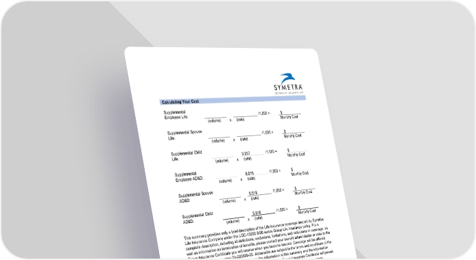 Calculating Your Cost Supplemental Employee Life: /1,000 = $ (volume) x (rate) Monthly Cost Supplemental Spouse Life: /1,000 = $ (volume) x (rate) Monthly Cost Supplemental Child Life: 0.037 /1,000 = $ (volume) x (rate) Monthly Cost Supplemental Employee AD&D: 0.016 /1,000 = $ (volume) x (rate) Monthly Cost Supplemental Spouse AD&D: 0.016 /1,000 = $ (volume) x (rate) Monthly Cost Supplemental Child AD&D: 0.016 /1,000 = $ (volume) x (rate) Monthly Cost This summary provides only a brief description of the Life Insurance coverage insured by Symetra Life Insurance Company under the LGC-13000 8/06 series Group Life Insurance policy. For a complete description, including all definitions, exclusions, limitations, and reductions in coverage, as well as information on termination of benefits, please contact your benefit administrator or refer to the Group Insurance Certificate you will receive when you become insured. Coverage will be offered under Group Policy number 01-020899-00. All benefits are subject to the terms and conditions of the Group Policy. If there is a difference between the information in this summary and the information contained in the Group Insurance Certificate, the terms of the Group Insurance Certificate will prevail. The terms of coverage may change over time; always refer to your current Group Insurance Certificate for information regarding your insurance benefits. Insured by Symetra Life Insurance Company Symetra® is a registered service mark of Symetra Life Insurance Company. LGP-2319/Other-Class 1 2/17