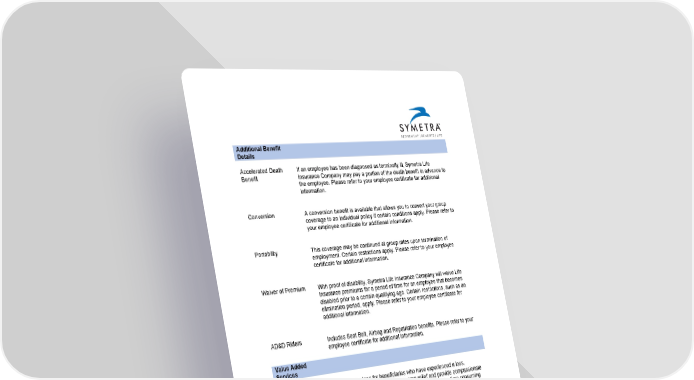 Additional Benefit Details Accelerated Death If an employee has been diagnosed as terminally ill, Symetra Life Benefit Insurance Company may pay a portion of the death benefit in advance to the employee. Please refer to your employee certificate for additional information. Conversion A conversion benefit is available that allows you to convert your group coverage to an individual policy if certain conditions apply. Please refer to your employee certificate for additional information. Portability This coverage may be continued at group rates upon termination of employment. Certain restrictions apply. Please refer to your employee certificate for additional information. Waiver of Premium With proof of disability, Symetra Life Insurance Company will waive Life Insurance premiums for a period of time for an employee that becomes disabled prior to a certain qualifying age. Certain restrictions, such as an elimination period, apply. Please refer to your employee certificate for additional information. AD&D Riders Includes Seat Belt, Airbag and Repatriation benefits. Please refer to your employee certificate for additional information. Value Added Services Beneficiary Support services for beneficiaries who have experienced a loss. Assistance Beneficiary Assistance can offer some relief and provide compassionate guidance to help with paperwork, notifications, and the time-consuming details of managing a loved one’s final affairs. Travel Assistance Pre-trip planning information and assistance, medical assistance and transport services, and emergency travel services and other assistance due to covered medical issues and emergencies that may occur when the insured or eligible dependent is on a trip 100 miles or more from home lasting 90 days or less. Identity Theft Identity theft assistance offers insureds and eligible dependents peace of Assistance mind by providing step-by-step coaching, fraud assistance, and document replacement to help resolve identity theft. Estate Planning Provides a simple, secure, and affordable online tool that allows insureds to decide what documents they need, from a last will and testament, living will, healthcare power of attorney, financial power of attorney, and/or final arrangements, for, at most, a minor additional fee. Contact Information for Claims Symetra® is a registered service mark of Symetra Life Insurance Company. LGP-2319/Other-Class 1 2/17