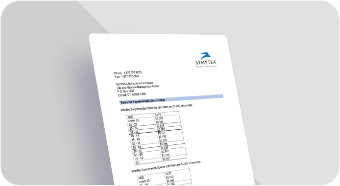 Phone: 1-877-377-6773 Fax: 1-877-737-3650 Symetra Life Insurance Company Life and Absence Management Center P.O. Box 1230 Enfield, CT 06083-1230 Rates for Supplemental Life coverage Monthly Supplemental Employee Life Rates per $1,000 of coverage AGE RATE Under 25 $0.039 25 - 29 $0.034 30 - 34 $0.044 35 - 39 $0.068 40 - 44 $0.101 45 - 49 $0.150 50 - 54 $0.230 55 - 59 $0.356 60 - 64 $0.426 65 - 69 $0.618 70 - 74 $1.114 75 - $3.207 Monthly Supplemental Spouse Life Rates per $1,000 of coverage AGE RATE Under 25 $0.050 25 - 29 $0.060 30 - 34 $0.080 35 - 39 $0.090 40 - 44 $0.124 45 - 49 $0.203 50 - 54 $0.313 55 - 59 $0.439 60 - 64 $0.660 65 - 69 $1.270 70 - 74 $2.060 75 - $3.951 Monthly Supplemental Child Life Rate per $1,000 of coverage is $0.0370 Monthly Supplemental Employee AD&D Rate per $1,000 of coverage is $0.0160 Monthly Supplemental Spouse AD&D Rate per $1,000 of coverage is $0.0160 Monthly Supplemental Child AD&D Rate per $1,000 of coverage is $0.0160 Symetra® is a registered service mark of Symetra Life Insurance Company. LGP-2319/Other-Class 1 2/17
