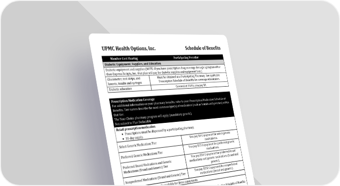 UPMC Health Options, Inc. Schedule of Benefits 2025_EPO_TAHS_LRG Med: K-11 Rx: $0/$15/$50/$100/$150 Page 6 of 8 Member Cost Sharing Participating Provider Diabetic Equipment, Supplies, and Education Diabetic equipment and supplies (NOTE: If you have prescription drug coverage through a program other than Express Scripts, Inc., that plan will pay for diabetic supplies and equipment first.) Glucometer, test strips, and lancets, insulin and syringes Must be obtained at a Participating Pharmacy. See applicable Prescription Schedule of Benefits for coverage information. Diabetic education Covered at 100%; you pay $0. Prescription Medication Coverage For additional information on your pharmacy benefits, refer to your Prescription Medication Schedule of Benefits. Tier names describe the most common type(s) of medication (such as brands and generics) within that tier. The Your Choice pharmacy program will apply (mandatory generic). Not subject to Plan Deductible Retail prescription medication • Prescriptions must be dispensed by a participating pharmacy. • 30-day supply. Select Generic Medications Tier You pay $0 Copayment for select generic medications. Preferred Generic Medications Tier You pay $15 Copayment for preferred generic medications. Preferred Brand Medications and Generic Medications (Brand and Generic) Tier You pay $50 Copayment for preferred brand medications and generic medications (brand and generic). Nonpreferred Medications (Brand and Generic) Tier You pay $100 Copayment for nonpreferred medications (brand and generic). 90-day maximum retail supply available for three copayments Specialty prescription medication • Specialty medications are limited to a 30-day supply. See Prescription Medication Schedule of Benefits for additional information. • Most specialty medications must be filled at our contracted specialty pharmacy provider (list available upon request). • Your prescription medication benefit includes coverage of certain specialty medications in the SaveOnSP program. See Prescription Medication Schedule of Benefits for additional information. Specialty Medications (Brand and Generic) Tier You pay $150 Copayment for specialty medications (brand and generic). Oral Chemotherapy Medications (Brand and Generic) You pay $0 Copayment for oral chemotherapy medications (brand and generic). 30-day maximum supply Mail-order prescription medication • A three-month supply (up to 90 days) of medication may be dispensed through the contracted mail-service pharmacy. Select Generic Medications Tier You pay $0 Copayment for select generic medications.