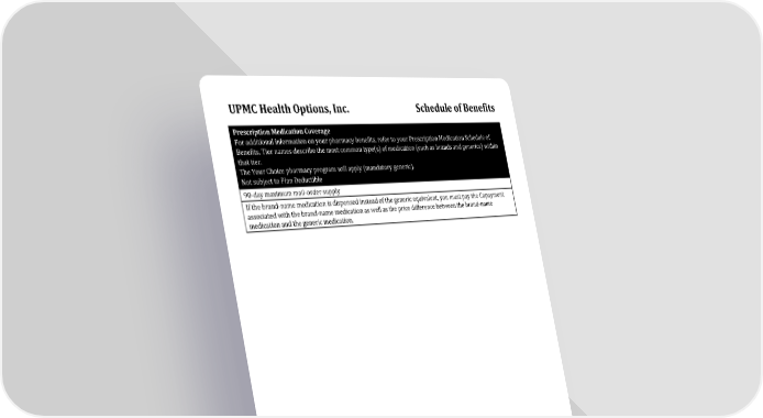 UPMC Health Options, Inc. Schedule of Benefits 2025_EPO_MCA_TAHS_LRG Med: K-7 Rx: $0/$15/$75/$125/$250 Page 8 of 9 Prescription Medication Coverage For additional information on your pharmacy benefits, refer to your Prescription Medication Schedule of Benefits. Tier names describe the most common type(s) of medication (such as brands and generics) within that tier. The Your Choice pharmacy program will apply (mandatory generic). Not subject to Plan Deductible 90-day maximum mail-order supply If the brand-name medication is dispensed instead of the generic equivalent, you must pay the Copayment associated with the brand-name medication as well as the price difference between the brand-name medication and the generic medication.