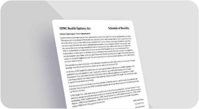 UPMC Health Options, Inc. Schedule of Benefits 2025_EPO_MCA_TAHS_LRG Med: K-7 Rx: $0/$15/$75/$125/$250 Page 9 of 9 Services that require Prior Authorization Certain services and items must be Prior Authorized in order to be eligible for reimbursement under your plan. This means you must contact UPMC Health Plan and obtain Prior Authorization before receiving services. A list of services that must be Prior Authorized is available 24/7 on our website at www.upmchealthplan.com. You can also contact Member Services by calling the phone number on your member ID card. Your provider may also access this list at www.upmchealthplan.com or your provider may call Provider Services at 1-866-918- 1595 to initiate the Prior Authorization process on your behalf. Regardless, you must confirm that Prior Authorization has been given in advance of your receiving services in order for those services to be eligible for reimbursement in accordance with your plan. Please note, the list of services that require Prior Authorization is subject to change throughout the year. You are responsible for verifying you have the most current information as of your date of service. The capitalized words and phrases in this Schedule of Benefits mean the same as they do in your COC. Also, the headings under the Covered Services section are the same as those in your COC. At all times, UPMC Health Plan administers the coverage described in this document in full compliance with applicable laws and regulations, and, if applicable, subject to approval by the Pennsylvania Insurance Department. If any part of this Schedule of Benefits conflicts with any applicable law, regulation, or other controlling authority, the requirements of that authority will prevail and UPMC Health Plan reserves the right to update this document accordingly. Your plan documents will always include the Schedule of Benefits, the COC, and the Summary of Benefits and Coverage. You can log into the UPMC Health Plan member site to view these documents. If you have questions, call Member Services. UPMC Health Plan is the marketing name used to refer to the following companies, which are licensed to issue individual and group health insurance products or which provide third party administration services for group health plans: UPMC Health Network Inc., UPMC Health Options Inc., UPMC Health Coverage Inc., UPMC Health Plan Inc., UPMC Health Benefits Inc., UPMC for You Inc., Community Care Behavioral Health Organization, and/or UPMC Benefit Management Services Inc. UPMC Health Plan U.S. Steel Tower 600 Grant Street Pittsburgh, PA 15219 www.upmchealthplan.com