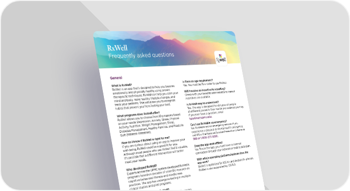RxWell Frequently asked questions General What is RxWell? RxWell is an app that’s designed to help you become emotionally and physically healthy using proven therapeutic techniques. RxWell can help you calm your mind and body, make healthy lifestyle changes, and track your patterns. This will allow you to recognize habits that prevent you from feeling your best. What programs does RxWell offer? RxWell allows you to choose from 10 programs based on your needs: Depression, Anxiety, Stress, Physical Activity, Nutrition, Weight Management, Sleep, Diabetes Management, Healthy Families, and Ready to Quit (tobacco cessation). How do I know if RxWell is right for me? If you are curious about using an app to improve your well-being, RxWell could be a good fit for you. Although most people who use RxWell find it valuable, it’s possible that a different intervention will better meet your needs. Who developed RxWell? Experts across the UPMC system developed RxWell’s programs based on decades of scientific research on cognitive behavioral therapy and mindfulness practices. The app has undergone testing in multiple clinical studies and pilot programs. How often should I use RxWell? We recommend using the app for about 15 minutes, two to three times each week. You can do longer sessions or use the app more frequently if you want. Do I have to pay for RxWell? RxWell is available to you at no cost through your employer. How long can I use the RxWell app? Eligible users can access RxWell at any time and use it for as long as they want. Most programs take one to two months to complete. Is there an age requirement? Yes. You must be 16 or older to use RxWell. Will I receive an incentive for enrolling? Check with your benefits administrator to learn if incentives are available. Is RxWell easy to understand? Yes. The app is designed for all types of people at different places in their health and wellness journey. If you ever have a question, email hponline@upmc.edu. Can I use RxWell in an emergency? No. RxWell is not an emergency service. If you experience a physical or mental health emergency, call 911 or the National Suicide Prevention Lifeline at 988 or 1-800-273-8255. Does the app work offline? No. To use the app, you must have an internet connection through your network or mobile data plan. With which operating platforms/systems does the app work? RxWell is optimized for iOS X+ and Android 9+ phones. RxWell is also supported by iOS 9.0.