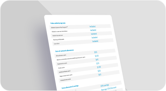 Value added programs SM Diabetic Eyecare Plus Program Included Diabetic exam reminder letters Included Health-focused care Included Hearing aid discounts Included Low vision Included Out-of-network allowances Bifocal lenses, up to $50 Elective contact lens materials and fitting/evaluation, up to $105 Examination, up to $45 Frame, up to $70 Lenticular lenses, up to $100 Single vision lenses, up to $30 Trifocal lenses, up to $65 Extra discounts & savings 5 Additional pairs of glasses 20% savings Laser vision correction (LVC) Average 15% Discount Average savings of 30% on other lens Lens enhancements enhancements 5 20% savings on unlimited additional pairs of prescription or non-prescription glasses/sunglasses, including lens enhancements, from a VSP provider within 12 months of your last WellVision Exam®. VSP QUESTIONS? VSP OUT-OF-NETWORK REIMBURSEMENT CLAIMS (800) 877 7195 PO Box 495918, Cincinnati, OH 45249-5918 BM-SOB-0036-202306