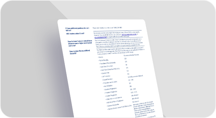 Page 3 https://www.vsp.com/offers/special-offers /glasses-sunglasses If I have additional questions, who can I talk too? Please don’t hesitate to contact us at 1 (866) 274-9887. Will I receive a vision ID card? No because providers only require the employees name, SS# and DOB to verify benefits. However, if you would like to do so, you can go to www.vsp.com/create-account or vsp.com/register.html to register with VSP and obtain an ID card. Does the lower Costco in-network frame allowance mean a higher out-of-pocket cost to me? No, this is because Costco’s model is closer to wholesale pricing with minimal mark-up as compared to our other in-network providers. So, although Costco frame allowances are lower, you do not incur any additional out-of-pocket expense by visiting a Costco provider. The Costco in-network providers just agree to accept a lower fee as payment in full. Does my plan offer any additional discounts? Yes, there are discounted benefits and special offers included as value adds to your plan if you visit an in-network provider. Note that these discounts are not applicable to Walmart or Costco, except as noted. These discounts are subject to VSP change. • Service Discounted Member Payment • Retinal Imaging $39 • Transitions/ Photochromatic $75 • Solid Tints (Pink I & II) $0 • Solid Tints (Other than Pink I & II) $15 • Gradient Tint $17 • UV Protection $16 • Scratch Resistant $33 (fully covered at Walmart) • Polycarbonate for adults $31 - $35 • Anti-Reflective $41 • Standard Progressive $55 • Premium Progressive $95 - $105 • Custom Progressive $150 - $175 • Other Add-ons and Services 20% off retail • Additional Pairs of Eyeglasses 20% off retail • Eyewear Accessories No discount • Elective Contact Lenses Fit & Follow up Fee $60 copay on first set, and 15% discount on each additional. Copay only applies to elective contact lenses. Additional fit and follow up fee is not applicable to necessary contact lenses. ($60 copay on first set at Walmart but no extra discount on additional services.) • Laser Vision Surgery Average 15% off the regular price or 5% off the promotional price • Other Special Offers $20 - $40 feature frame coupons available at