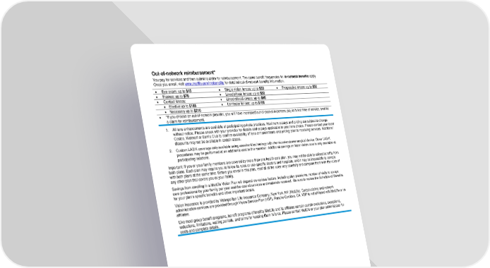 VI-STAND Vision Benefit Summary 200 Park Ave., New York, NY 10166 © 2024 MetLife Services and Solutions, LLC L0423030985[exp0426][All States] Out-of-network reimbursement* You pay for services and then submit a claim for reimbursement. The same benefit frequencies for In-network benefits apply. Once you enroll, visit www.metlife.com/mybenefits for detailed out-of-network benefits information. • Eye exam: up to $45 • Single vision lenses: up to $30 • Progressive lenses: up to $50 • Frames: up to $70 • Lined bifocal lenses: up to $50 • Contact lenses: • Lined trifocal lenses: up to $65 • Elective up to $105 • Lenticular lenses: up to $100 • Necessary up to $210 • *If you choose an out-of-network provider, you will have increased out-of-pocket expenses, pay in full at time of service, and file a claim for reimbursement. 1. All lens enhancements are available at participating private practices. Maximum copays and pricing are subject to change without notice. Please check with your provider for details and copays applicable to your lens choice. Please contact your local Costco, Walmart or Sam’s Club to confirm availability of lens enhancements and pricing prior to receiving services. Additional discounts may not be available in certain states. 2. Custom LASIK coverage only available using wavefront technology with the microkeratome surgical device. Other LASIK procedures may be performed at an additional cost to the member. Additional savings on laser vision care is only available at participating locations. Important: If you or your family members are covered by more than one health care plan, you may not be able to collect benefits from both plans. Each plan may require you to follow its rules or use specific doctors and hospitals, and it may be impossible to comply with both plans at the same time. Before you enroll in this plan, read all of the rules very carefully and compare them with the rules of any other plan that covers you or your family. Savings from enrolling in a MetLife Vision Plan will depend on various factors, including plan premiums, number of visits to an eye care professional by your family per year and the cost of services and materials received. Be sure to review the Schedule of Benefits for your plan’s specific benefits and other important details. Vision insurance is provided by Metropolitan Life Insurance Company, New York, NY (MetLife). Certain claims and network administration services are provided through Vision Service Plan (VSP), Rancho Cordova, CA. VSP is not affiliated with MetLife or its affiliates. Like most group benefit programs, benefit programs offered by MetLife and its affiliates contain certain exclusions, exceptions, reductions, limitations, waiting periods, and terms for keeping them in force. Please contact MetLife or your plan administrator for costs and complete details.