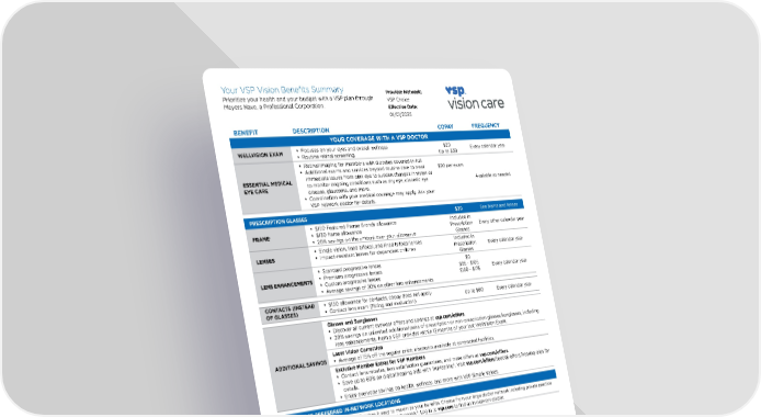 Your VSP Vision Benefits Summary Prioritize your health and your budget with a VSP plan through Meyers Nave, a Professional Corporation. FREQUENCY COPAY DESCRIPTION BENEFIT YOUR COVERAGE WITH A VSP DOCTOR Every calendar year $20 WELLVISION EXAM Focuses on your eyes and overall wellness Up to $39 Routine retinal screening Available as needed ESSENTIAL MEDICAL EYE CARE Retinal imaging for members with diabetes covered-in-full $20 per exam Additional exams and services beyond routine care to treat immediate issues from pink eye to sudden changes in vision or to monitor ongoing conditions such as dry eye, diabetic eye disease, glaucoma, and more. Coordination with your medical coverage may apply. Ask your VSP network doctor for details. See frame and lenses $20 PRESCRIPTION GLASSES Every other calendar year Included in Prescription Glasses FRAME⁺ $150 Featured Frame Brands allowance $130 frame allowance 20% savings on the amount over your allowance Every calendar year Included in Prescription Glasses LENSES Single vision, lined bifocal, and lined trifocal lenses Impact-resistant lenses for dependent children Every calendar year $0 LENS ENHANCEMENTS Standard progressive lenses $95 - $105 Premium progressive lenses $150 - $175 Custom progressive lenses Average savings of 30% on other lens enhancements Every calendar year Up to $60 CONTACTS (INSTEAD OF GLASSES) $130 allowance for contacts; copay does not apply Contact lens exam (fitting and evaluation) Glasses and Sunglasses ADDITIONAL SAVINGS Discover all current eyewear offers and savings at vsp.com/offers. 20% savings on unlimited additional pairs of prescription or non-prescription glasses/sunglasses, including lens enhancements, from a VSP provider within 12 months of your last WellVision Exam. Laser Vision Correction Average of 15% off the regular price; discounts available at contracted facilities. Exclusive Member Extras for VSP Members Contact lens rebates, lens satisfaction guarantees, and more offers at vsp.com/offers. Save up to 60% on digital hearing aids with TruHearing®. Visit vsp.com/offers/special-offers/hearing-aids for details. Enjoy everyday savings on health, wellness, and more with VSP Simple Values. GET MORE AT PREFERRED IN-NETWORK LOCATIONS With so many in-network choices, VSP makes it easy to maximize your benefits. Choose from our large doctor network including private practice and retail locations. Plus, you can shop eyewear online at Eyeconic®. Log in to vsp.com to find an in-network doctor. Provider Network: VSP Choice Effective Date: 01/01/2025