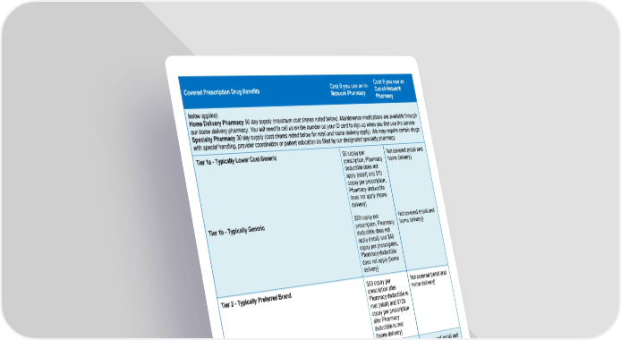 Page 5 of 9 Covered Prescription Drug Benefits Cost if you use an In- Network Pharmacy Cost if you use an Out-of-Network Pharmacy below applies). Home Delivery Pharmacy 90 day supply (maximum cost shares noted below). Maintenance medications are available through our home delivery pharmacy. You will need to call us on the number on your ID card to sign up when you first use the service. Specialty Pharmacy 30 day supply (cost shares noted below for retail and home delivery apply). We may require certain drugs with special handling, provider coordination or patient education be filled by our designated specialty pharmacy. Tier 1a - Typically Lower Cost Generic $5 copay per prescription, Pharmacy deductible does not apply (retail) and $10 copay per prescription, Pharmacy deductible does not apply (home delivery) Not covered (retail and home delivery) Tier 1b - Typically Generic $20 copay per prescription, Pharmacy deductible does not apply (retail) and $40 copay per prescription, Pharmacy deductible does not apply (home delivery) Not covered (retail and home delivery) Tier 2 - Typically Preferred Brand $50 copay per prescription after Pharmacy deductible is met (retail) and $125 copay per prescription after Pharmacy deductible is met (home delivery) Not covered (retail and home delivery) Tier 3 - Typically Non-Preferred Brand $75 copay per prescription after Pharmacy deductible is met (retail) and $188 copay per prescription after Pharmacy deductible is met (home delivery) Not covered (retail and home delivery) Tier 4 - Typically Specialty (brand and generic) 30% coinsurance up to $250 per prescription after Pharmacy deductible is met (retail and home delivery) Not covered (retail and home delivery)