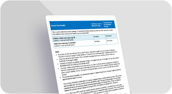 Page 6 of 9 Covered Vision Benefits Cost if you use an In- Network Provider Cost if you use an Out-of-Network Provider This is a brief outline of your vision coverage. To receive the In-Network benefit, you must use a Blue View Vision Provider. Only children's vision services count towards your out-of-pocket limit. Children’s Vision exam (up to age 19) Limited to 1 exam per benefit period. No charge Not covered Adult Vision exam (age 19 and older) Limited to 1 exam per benefit period. No charge Not covered Notes: • If you have an office visit with your Primary Care Physician, Specialist or Urgent Care at an Outpatient Facility (e.g., Hospital or Ambulatory Surgical Facility), benefits for Covered Services will be paid under “Outpatient Facility Services”. • Costs may vary by the site of service. Other cost shares may apply depending on services provided. Check your Certificate of Coverage for details. • The limits for physical, occupational, and speech therapy, if any apply to this plan, will not apply if you get care as part of the Mental Health and Substance Use Disorder benefit. • Coverage includes standard fertility preservation services as a basic healthcare service including but are not limited to, injections, cryopreservation and storage for both male and female members when a medically necessary treatment may cause iatrogenic infertility. Member cost share for fertility preservation services is based on provider type and service rendered. • The representations of benefits in this document are subject to California Department of Managed Health Care (DMHC) approval and are subject to change. This summary of benefits is a brief outline of coverage, designed to help you with the selection process. This summary does not reflect each and every benefit, exclusion and limitation which may apply to the coverage. For more details, important limitations and exclusions, please review the formal Evidence of Coverage (EOC). If there is a difference between this summary and the Evidence of Coverage (EOC), the Evidence of Coverage (EOC), will prevail. Anthem Blue Cross HMO benefits are covered only when services are provided or coordinated by the primary care physician and authorized by the participating medical group or independent practice association (IPA); except OB/GYN services received within the member's medical group/IPA, and services for mental health and substance use disorders. Benefits are subject to all terms, conditions, limitations, and exclusions of the EOC. Anthem Blue Cross is the trade name of Blue Cross of California. Independent licensee of the Blue Cross Association. ® ANTHEM is a registered trademark of Anthem Insurance Companies, Inc. The Blue Cross name and symbol are registered marks of the Blue Cross Association. Questions: (855) 333-5730 or visit us at www.anthem.com/ca